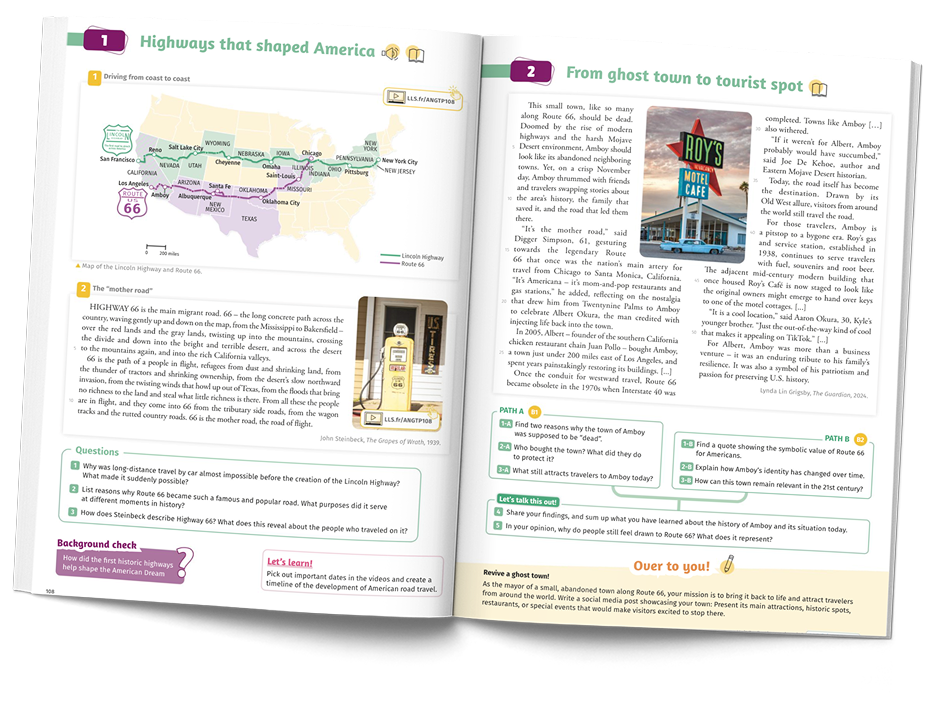 Pour prolonger la réflexion sur les thématiques des unités par la voie de la fiction, la collection propose des doubles-pages culturelles Book Club. Ces pages confrontent les élèves à des extraits littéraires longs, méticuleusement choisis parmi des œuvres classiques ou récentes. Pour faciliter l'immersion, chaque extrait est mis en contexte grâce à une note sur l'auteur et un résumé de l'œuvre. Guidés par un questionnement de compréhension progressif, les élèves abordent un vocabulaire plus complexe, ce qui offre une ressource précieuse aux enseignants pour nourrir les élèves ayant le plus de facilité, tout en donnant à tous l'envie de lire en toute autonomie.