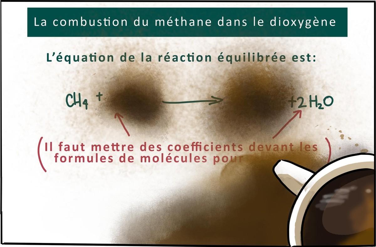 Pour la Fête de la Science, Anna et Rachid ont préparé un atelier avec des expériences et une affiche sur la combustion du méthane. Ils ont compris comment, par réorganisation des atomes, les réactifs se transforment en produits. Ils ont même trouvé comment écrire dans l'équation de réaction que la transformation conserve les atomes. Tout était prêt avant que le père d'Anna ne renverse accidentellement sa tasse sur le polycopié !