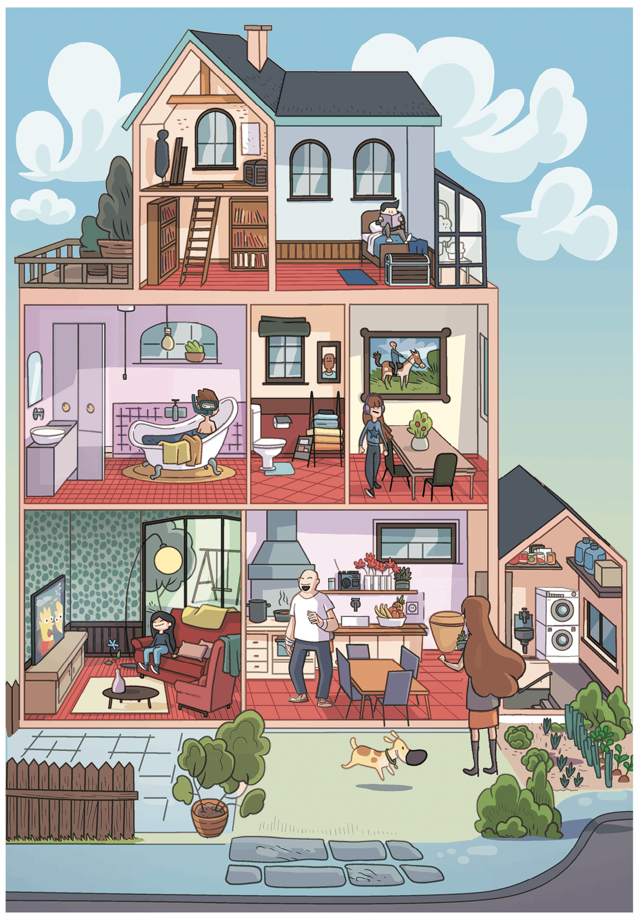 Compare cette illustration avec celle de ton manuel et retrouve les cinq différences. Décris précisément où elles se situent dans la maison en utilisant there is / there are.