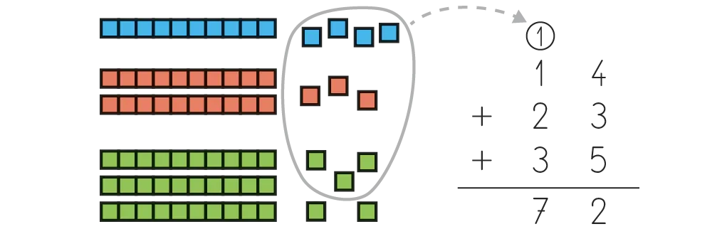 « Vous allez vous entraîner à calculer des additions en colonnes par deux dans votre cahier de recherche. Un élève guidera l'autre en lui expliquant ce qu'il doit écrire. L'élève qui a le crayon peut ne pas écrire s'il n'est pas d'accord, dans ce cas il doit expliquer pourquoi. Les rôles sont inversés à chaque calcul. »