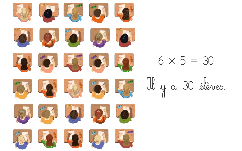 Les élèves vont calculer le nombre d'élèves présents dans une salle de classe disposée en « configuration rectangulaire ». Le but est de modéliser le problème à l'aide de deux produits différents et de réaliser qu'ils sont égaux.