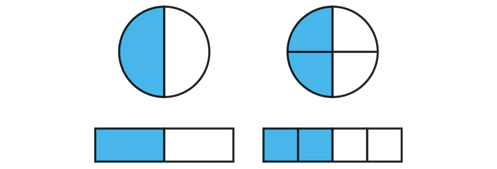 « Pour colorier un demi-disque et une demi-bande, il faut colorier la moitié des figures. Cela correspond à deux morceaux du tout coupé en quatre. Un demi, c'est pareil que deux quarts. »