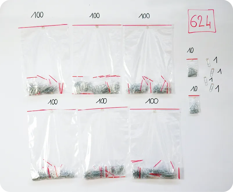 S'appuyer sur leurs réponses pour expliquer : « Vous aurez des petits et des grands sachets. Dans chaque petit sachet, vous mettrez 10 trombones, puis vous écrirez "10" dessus. Ce sont des dizaines. Quand vous aurez 10 petits sachets prêts, vous pourrez les mettre dans un grand sachet et écrire "100" dessus car il y aura 100 trombones à l'intérieur. Ce sont des centaines. Vous allez coopérer et vous répartir le travail, car le nombre d'objets à dénombrer est important. »