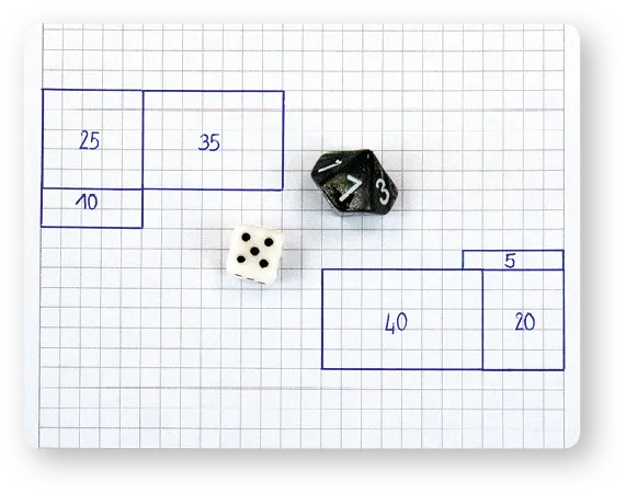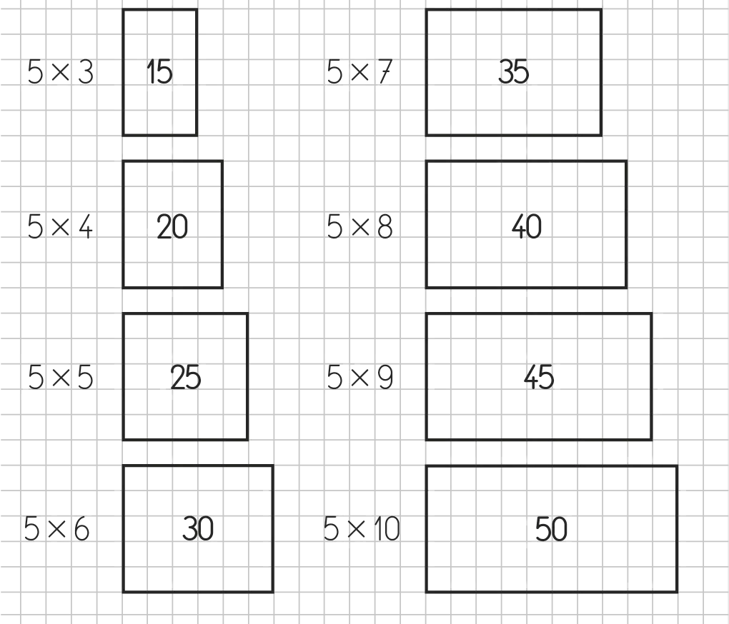 « Le premier rectangle, 5 × 1, est égal à 5, car on dénombre bien cinq carreaux à l'intérieur. Le second rectangle, 5 × 2, est égal à 10, car on dénombre bien dix carreaux à l'intérieur. »