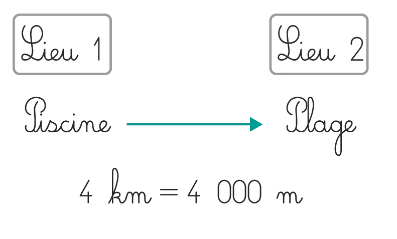 « Voici l'itinéraire de l'école jusqu'à la piscine. Entre les deux lieux, il y a 3 km. Comment pouvez-vous exprimer cette distance en mètre ? »